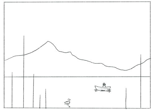 Grab your ruler and draw a horizon line one-third of the way up the paper from the bottom. This will be the lake. Next, lightly sketch in your distant mountains, and use a ruler to sketch out where your foreground pine trees will be. I placed some pines in the left- and right-hand corners of the paper. On the right side of the lake, roughly sketch out the shape of a canoe with one man inside. You don’t need details here, just the basic shape of the canoe, which is sort of like a banana with a flat bottom. Since the lake will be flat and calm, there will be a reflection of the canoe in the water, so sketch out a few lines directly below the canoe to depict this. -