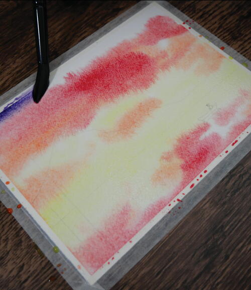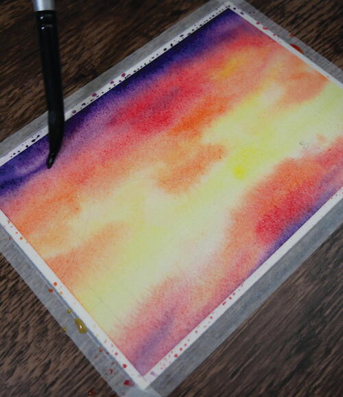 Once your first layer is dry, go ahead and rewet the entire paper again with clean water, starting from the lemon yellow section and working outward. If you added clean water from the top to the bottom of the paper, for example, the purple pigment may travel downward and end up mixing with the lemon yellow, muddying the bright, vibrant colors we’re looking to achieve.