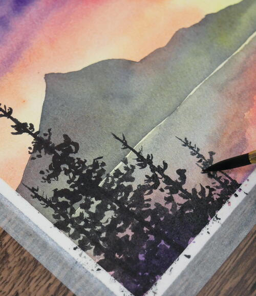 The mountain in this painting will also be a simple silhouette. Since the sun has dipped below the horizon, there is no light to shine on the details in the distance, hence why we’re painting a silhouette.