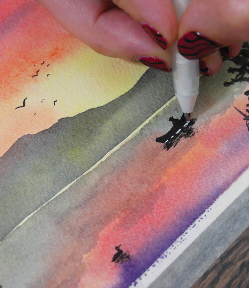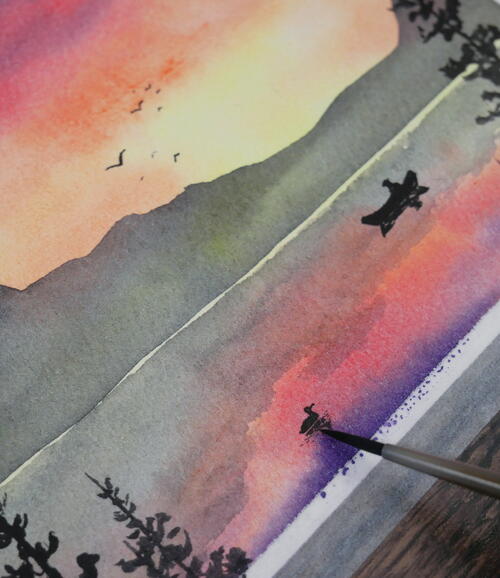 After your canoe, paint in a flock of birds high in the sky, above the mountain range silhouette. Vary the shapes and sizes of the birds so it looks like some are closer and some are farther away.
