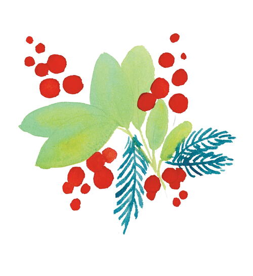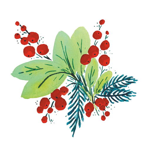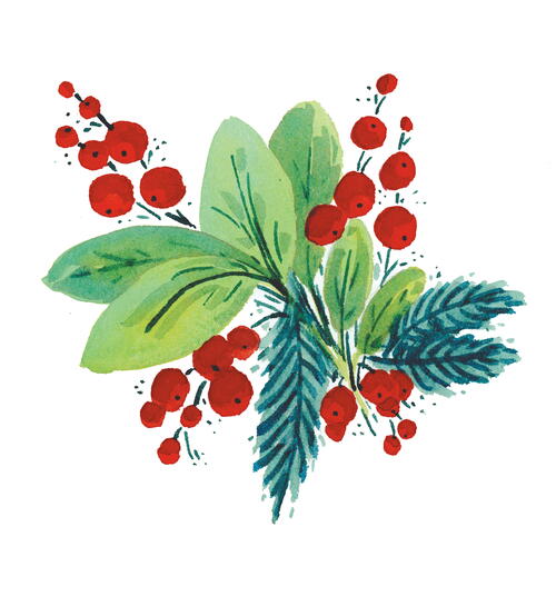 Darken the holly leaves with a Winsor Green (70%) and Alizarin Crimson (30%) mixture. This should be a lighter mixture than the one used in Step 4. To lighten the value, make sure to add more water on your palette.