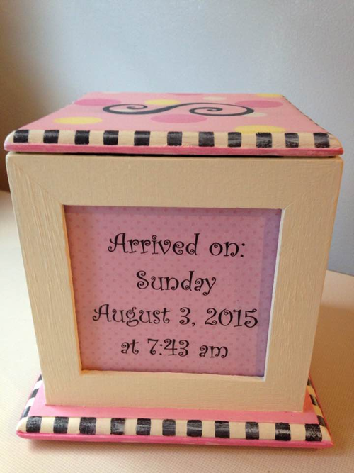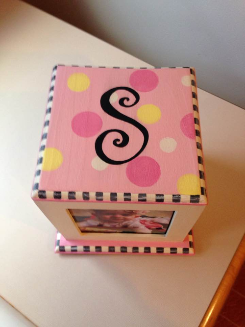 "Turn an inexpensive, unfinished memory frame cube is wonderful memory box to display a baby’s birth data and photo. The cube also doubles as a small memory box…just large enough to hold the hospital bracelet and cap, lock of hair, etc. You don't need any special painting skills to paint this project. You will be able to get great results by following step by step instructions. You'll learn tricks on how to transfer a pattern and make perfect polka-dots! Substitute colors are listed for making a traditional "boy" cube. "