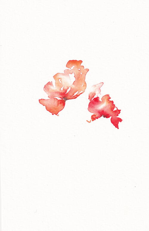 Observe how the poppy head is looking and paint the flower heads with clean water and a medium brush (size 6). You can’t be super precise and that is exactly the point, because you don’t have to be. Just make sure to leave random white spaces and you are good. Tilt your head a bit so the light catches the water surface. That way, it is easier to see what you are doing. Now drip in a mix of new gamboge and pyrrol scarlet and let it flow freely in the water. When it starts to dry (but is not completely dry), drip in a small amount of Payne’s gray at the bottom of the flower. Let it flow into the flower head and then dry. I know this seems annoying because you just got started, but good things are worth the wait. So, paint another one or two in the meantime.
