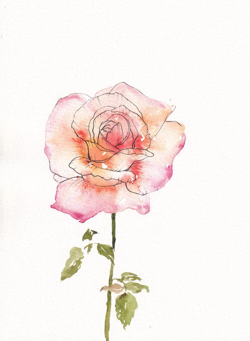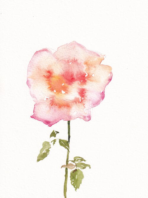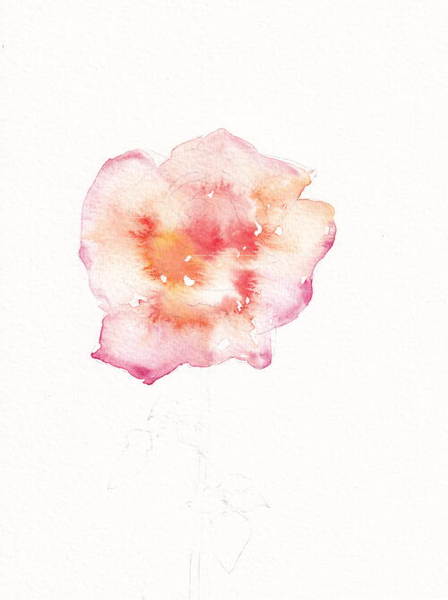 Now wet the entire rose head with a big brush (size 7) and drip in pyrrol scarlet and new gamboge close to the center. At the edge you can use a cool red like quinacridone rose. Let it all mix and mingle. Don’t be scared of water and color bleeds—they will be the magic of this flower. After it has dried a bit, you can drip in a little more color to areas that might be in shadow. Wait patiently for it to dry. Since it is the flower of love, maybe spend the break by sending your partner a kissing emoji.