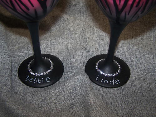Use a pencil to mark a circle where the stem meets the foot. Use the tweezers to pick up one rhinestone at a time and place along the pencil line. Use the toothpick to apply a tiny amount of glue to the back. Set in place on the foot of the glass. Avoid getting excess glue on the foot. Repeat until a circle of rhinestone is complete. Let dry. Use the liner and the Chalkboard paint to carefully paint over any glue showing around rhinestones.