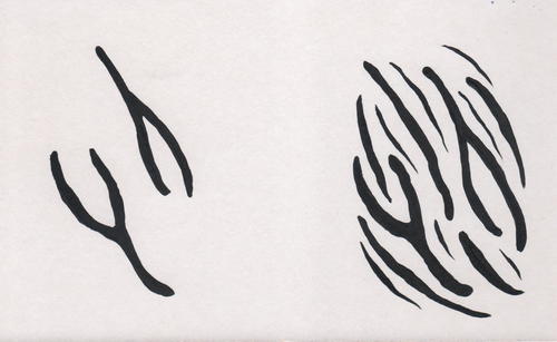 Use dry or barely damp brushes to apply paint to glass. Do not thin paint with water. Use #2 round and a generous amount of Black to freehand Y shapes diagonally on the bowl (Fig. 1). Use the liner brush to make smaller irregular stripes to fill in-between the Y’s. Use the liner brush to finish the stripes to a fine point and to make some thin lines here and there (Fig. 2). Continue the pattern until the bowl is filled with design. Let dry several hours of overnight. Touch up any areas not fully covered with a light 2nd coat of paint.