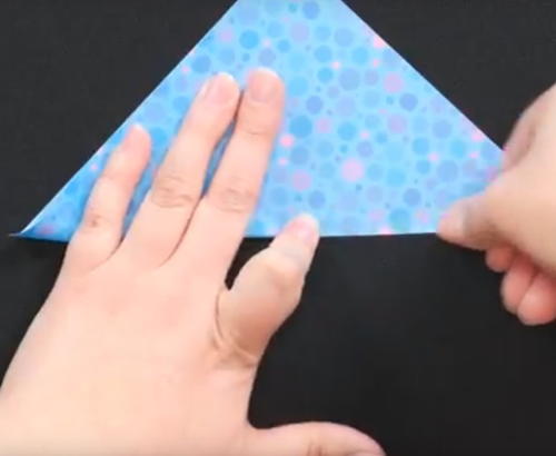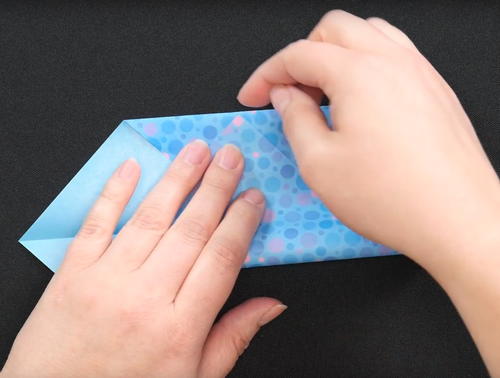 Take the left point and fold it upward so the bottom edge lines with the middle vertical crease.