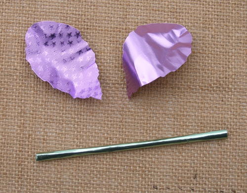 Fold a leaf in half and glue to the bottom of the stem. Repeat for the second flower. Bend and shape leaves.