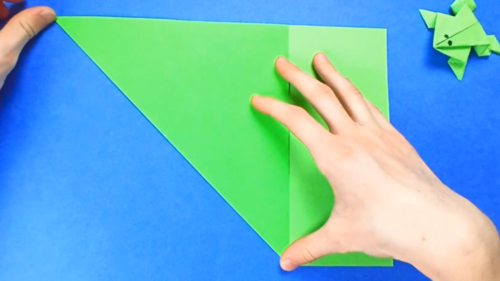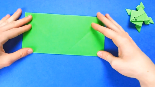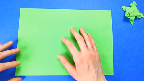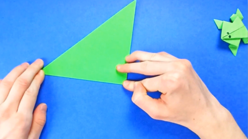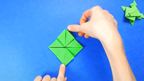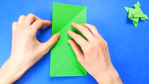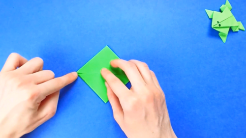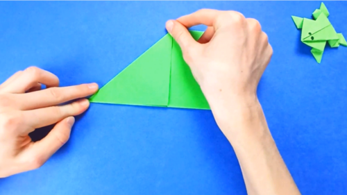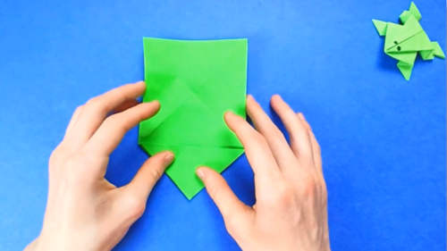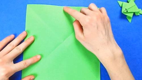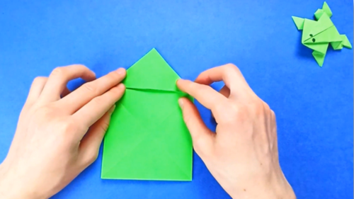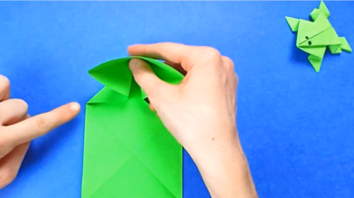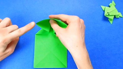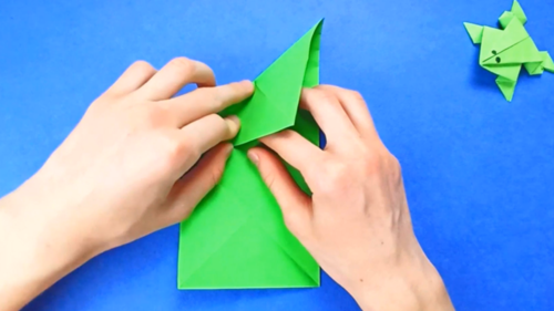 Bend the upper corner in the same way and turn the craft with the frog's head up.