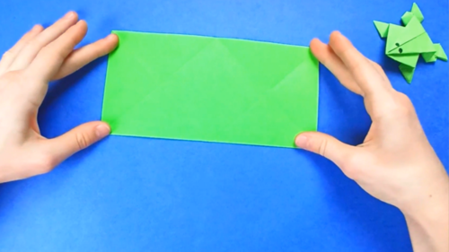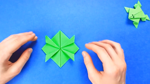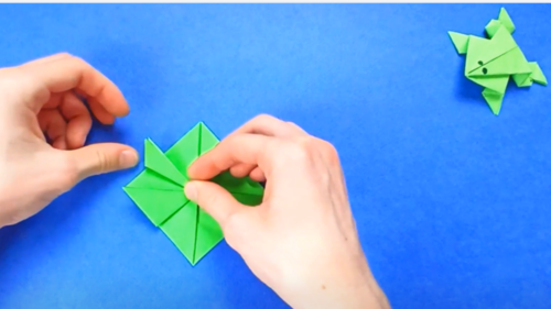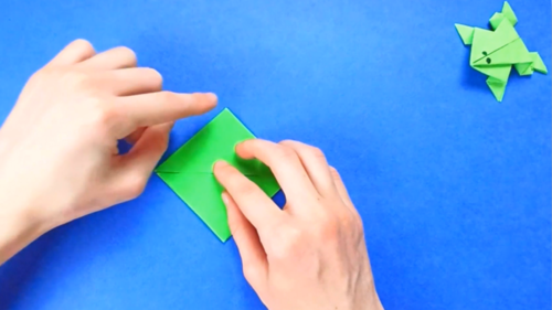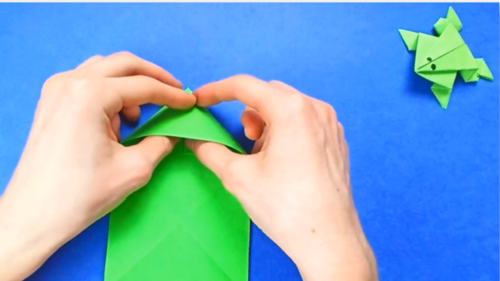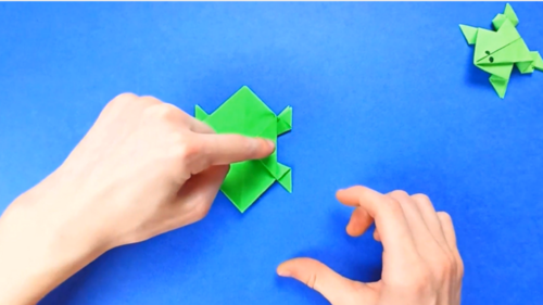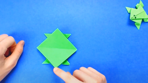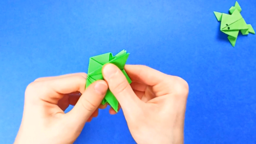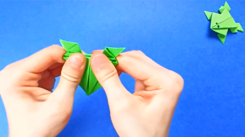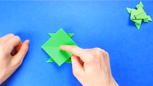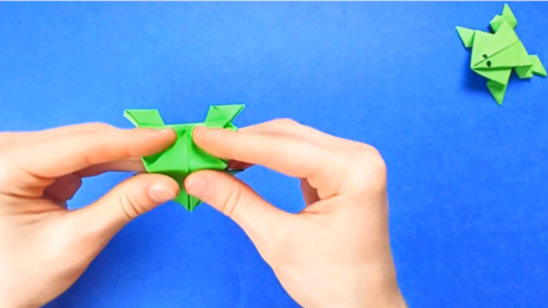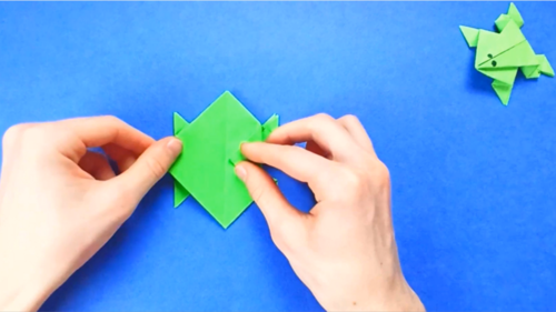 Turn the craft with the frog's head down and press the fixed fold to the frog's legs.