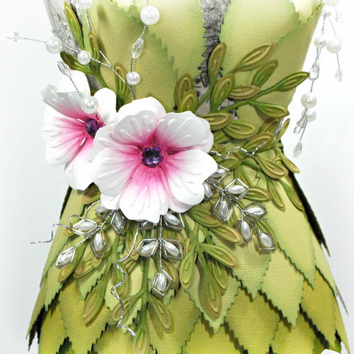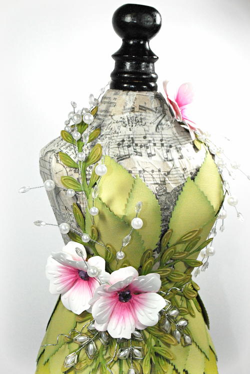 From the Designer: "This Altered Dress Form was inspired by the beautiful wildflowers that bloom that grow where I live. It's made mainly of paper and all leaves and flowers were die cut and shaded by hand. This project can be made in less than 6 hours (depending on your crafting experience). The finished piece is adorned with beaded garland and picks. It is spring themed but could easily be modified to suit different seasons. It would make a gorgeous addition to your home decor for that add an extra wow factor. It's a definite conversation piece."