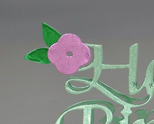 Die cut Happy Birthday from pale green textured and pale green smooth foiled paper. Die cut flower from pink and the leaves from dark green textured foiled paper.