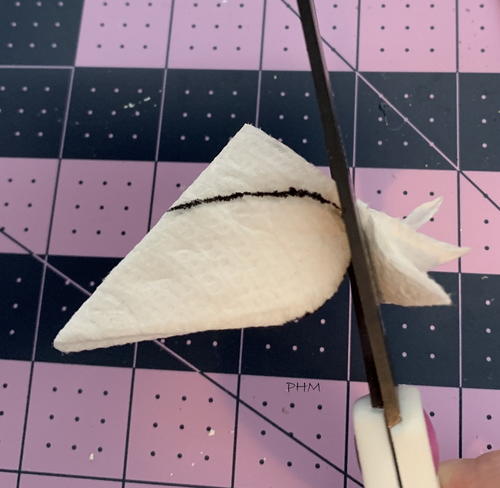 Here's a drawn-on line to show where to cut to make the eight petal bloom. But it's best to do this cut freehand. Start cutting at the side open edges, just below the middle section, around the next open edges and ending slightly lower at the middle folded area. The cut area should begin and end evenly across the same point.
