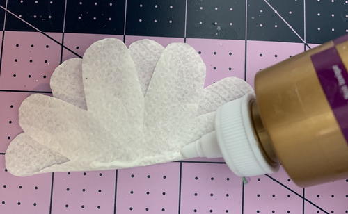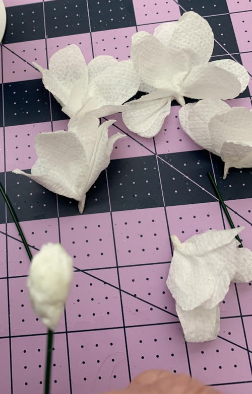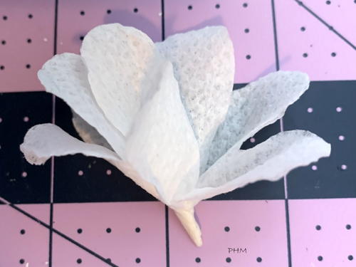 Once the bud is dry, glue on the five flower blooms, one at a time, around the bud adjusting, curving the ends and fluffing petals to form larger flower.