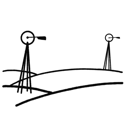 Place the stilts for two windmills. This means drawing four lines that meet in one point and putting a circle on top. Put a dot in the center of the circle and start drawing the tail from that point. The windmill in the foreground is drawn with a medium (05) nib, the one in the back with the thin (01) pen. Note that the front one is taller.