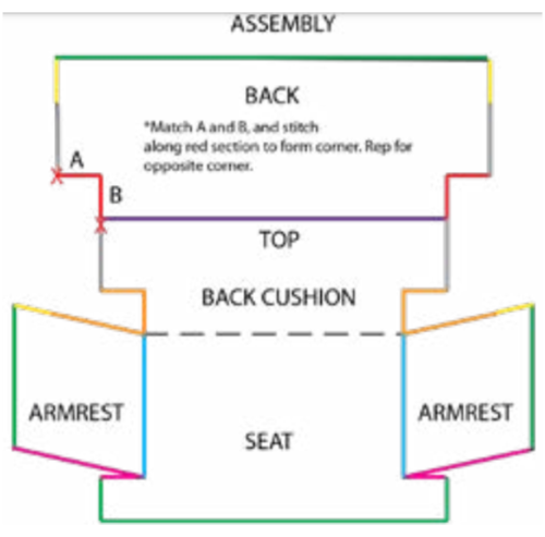 Sew Armrest Ends to Armrest and seat as indicated in pink in diagram.