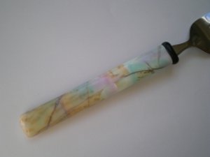 - Apply a thin layer of Bake & Bond or Sculpey Translucent Liquid clay to the clay covered silverware handle. Cover the White sheet with your veneer, carefully mend seams.