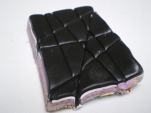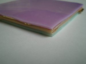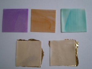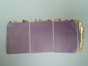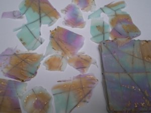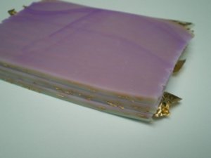 - Tint Translucent clay with 3 different colors. Tint one ounce of Translucent with a 1/4" ball of Purple, another one ounce of translucent with 1/4" ball of Gold, and one ounce of Translucent with 1/4" ball of Peacock Pearl. Roll out each color out on a medium setting of the Clay Conditioning Machine. Roll two more sheets of Translucent on a thin setting of the Clay Conditioning Machine. Cover each thin sheet with a layer of imitation Gold leaf.