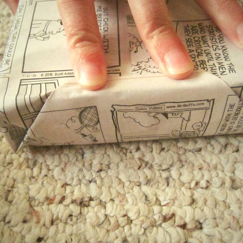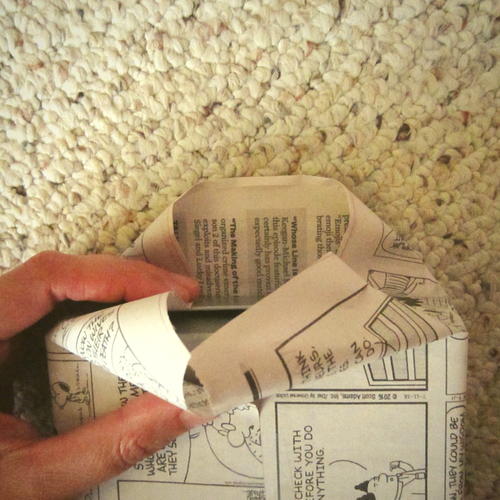 Well, this was pretty straightforward. What makes this easier is a newspaper is cut out into a rectangle and if you have a square box, you have plenty of leftover the newspaper to wrap your gift properly and tuck those edges in neatly. If you have a larger box, you might need two newspaper pages.