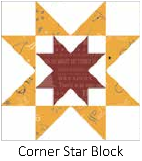 These instructions are to make 1 block. Refer to the Corner Star Block diagram for piece placement. Draw a line from corner to corner on the wrong side of a 1½” assorted print squares. Place the square in the corner of a 1½” x 2½” putty solid rectangle and sew on the drawn line. Leave a ¼” seam allowance and trim excess. Press. Repeat on the other side of the rectangle. This will make 1 Flying Geese Unit. Repeat to make 4 Flying Geese Units.