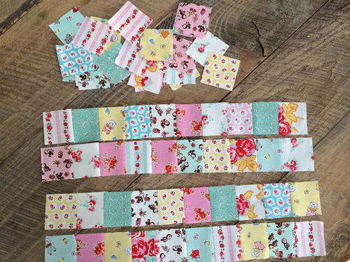 (1/4″ seams throughout ) Sew the 2.5″ squares into 4 rows of 10 squares. Press seams in alternating directions for each row. Sew 2 rows together, matching at seam intersections - This will give you 2 pieced borders.