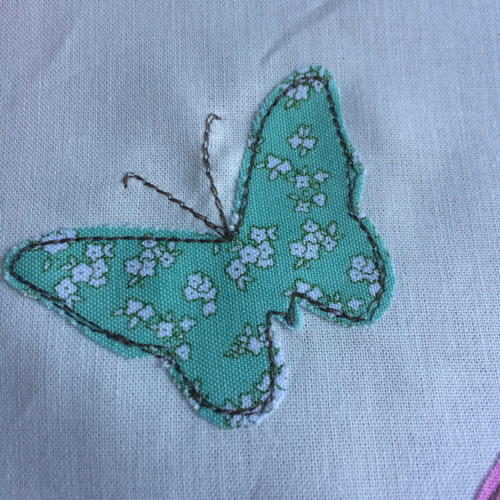 Cut out each applique piece along the pattern line and peel off the backing paper. Position the rabbits and butterflies as desired. Fuse with a hot iron. Sew around each applique piece with accent thread. Sew antennas for each of the butterflies.