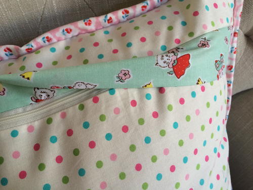 Using a zipper foot, sew the larger piece of the pillow back to the zipper. Press.