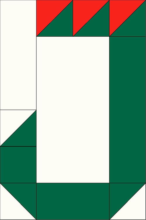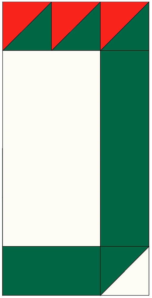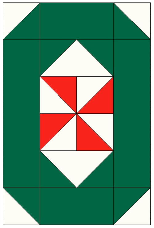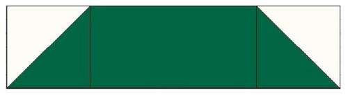 Sew a white 2 3/4″ x 4 1/4″ rectangle to each side of a green 2″ x 4 1/4″ rectangle, press to the green.