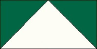 Mark the wrong side of 4 green 2″ x 2″ squares in half diagonally once. Lay a marked green square over a white 2″ x 3 1/2″ rectangle so the high point of the marked line points to the center. Sew on the marked line. Trim a quarter inch from the sewn line and press to the green. Make 2 Flying Geese units measuring 2” x 3 1/2″ unfinished size.