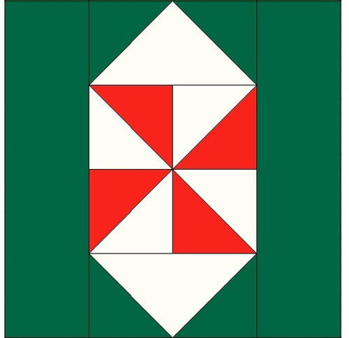 Sew a Flying Geese unit to the top and the bottom of the Pinwheel Unit. Sew a green 2″ x 6 1/2″ rectangle to the left and the right side of the previous unit.