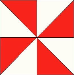 Sew Red/White HSTs into pairs, and press towards the red. Sew the pairs into a Pinwheel as shown, and press in one direction.
