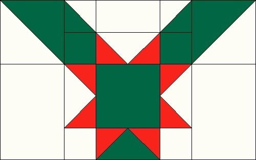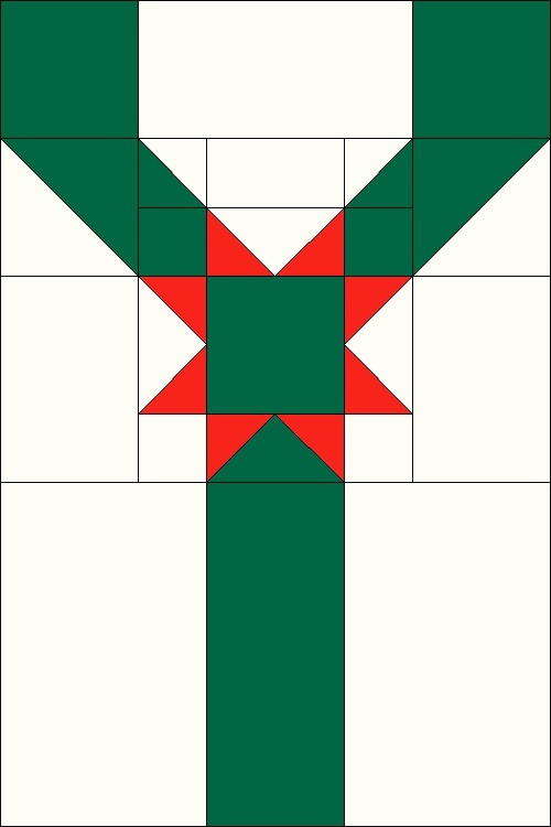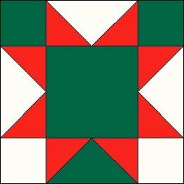 Using the Flying Geese, 2 green 1 1/4″ squares, 1 green 2″ square, and 2 white 1 1/4″ squares, lay out the block as shown above. Sew the top row and press to the squares, sew the middle row and press to the center, sew the bottom row and press to the squares. Sew the rows together and press to the center to make the Sawtooth Star unit.