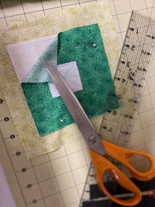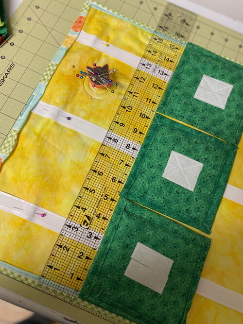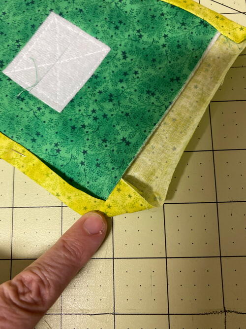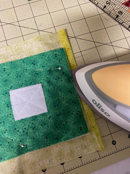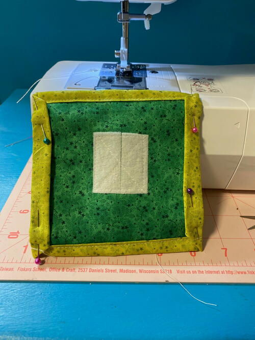 Assemble the puzzle pieces- On the right side center of your 5” x 5” squares of fabric, center two -2” pieces of loop side Velcro©- forming a rectangle, pin in place and then stitch around all four sides and then diagonally down both middles forming an “X”. Repeat with remaining 11 pieces. Match the wrong side of the 5”x5” squares of fabric to the adhesive side of the fusible interfacing. Iron interfacing to fabric following manufacturers instructions. Create your puzzle piece “quilt sandwiches” -Bottom layer 7”x7” fabric square face down, center 5”x5” square face up. Pin together. Repeat with all pieces. (See photo) Iron to prepare for creating a “Double Folded Hem/Binding” (just a note you will be creating a double folded hem/binding for all edges on both the puzzle pieces and the base) Fold raw edge of bottom (larger) square of fabric in 1/2” iron in place. Fold another 1/2” so it now overlaps the smaller piece and iron again. Repeat on all 4 sides and with all 12 pieces. Pin to hold two -parallel sides in place on one square. Stitch through all layers of fabric right next to the folded edge (It will be a “scant” 1/2” seam allowance) backstitch beginning and end of seam.(See photo) On the unsewn sides. Open flat, then fold corners on themselves at a 90 degree angle, then following your iron marks fold the raw edge in on itself to create a mitered corner. Pin to hold then stitch along the fold through all layers of fabric (again using that “scant” 1/2” seam allowance) (see photo) be sure to backstitch beginning and end of seam. Repeat with remaining puzzle pieces. And set aside.