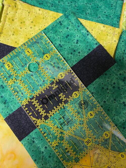 Design your city- To create roads: cut, 1” x 5 strips of black fabric backed with Heat n Bond lite. Iron the road strips to the top side of the puzzle squares. If you desire for all roads to be interchangeable, be sure to iron the strips between the 2” and 3” mark. ( See photo.) A see-thru ruler is really helpful to line pieces up properly. Placing the roads at this point assures that all pieces can connect no matter how the piece is turned. Make some pieces single roads, some cross roads. A variety of pieces makes your city more interesting. (See finished photo for ideas.) For landscape and other features- Cut up your colored pieces of Heat n bond-ed fabric. Let out your inner child and keep shapes simple. Create trees out of triangles and small strips. Or cloud shape and strips. Triangles become mountains. A rectangle and triangle put together becomes a house or a building. A small strip of black and some circles becomes a stop light… The possibilities are endless! Iron all Heat n Bond backed fabric pieces in place following manufacturer instructions.