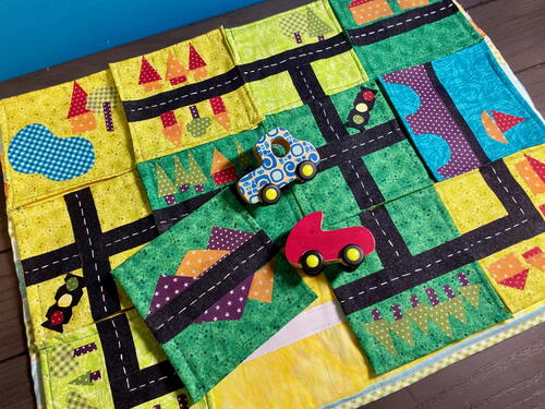 "Who doesn’t love driving their toy cars through the city? What if you could change that city every time you drove through it?? Created with colorful fabric, fusible interfacing, Velcro©, and some DIY iron-on appliqués, this Quilted Puzzle Play Mat is sure to be ever-changing fun for your little ones. The best part, it folds up to fit in a diaper bag or backpack! Little one doesn’t play with cars? Instead of appliquéing a city….how about a jungle scene with toy animals, a castle scene or alien planet to land on with your spaceship... the only limit is your imagination!"