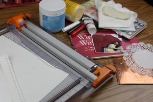 First, trim some watercolor paper to measure 8.5 by 11 inches using the Fiskars SureCut Paper Trimmer. Watercolor paper is thicker than cardstock, and will not warp with all of the water and textures we are going add. I also gathered my supplies, including some gesso, acrylic paints, brushes, gelatos, a copper metal sheet, a doily and burlap. But don’t worry, you can use any supplies available to you!