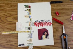 Now chose where you would like to place your photo. I chose the bottom right hand corner. Adhere down a banner, paper strips and some tissue paper. Then add some color with bright red and black gelatos. Gelatos look like oil pastels, but are water-soluble. So after scribbling with the gelatos, I used a wet brush to smooth the color over the paper.