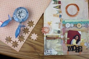 Now go ahead and add some embellishments to your layout. Adhere the photo down and add some doodles using a black pen. I also added some machine stitching onto the edge of the paper. Punch some quilt stars using the Fiskars squeeze punch and layer a couple of these quilt stars together. Staple them onto the layout above the tissue paper circle.