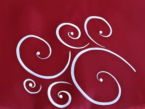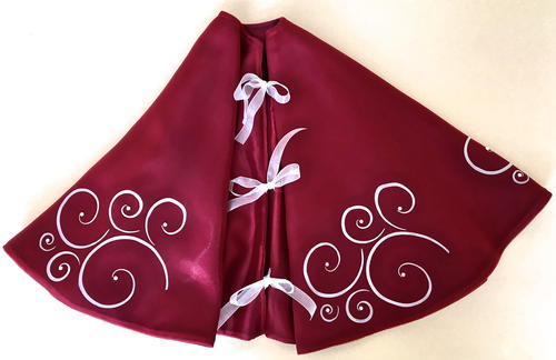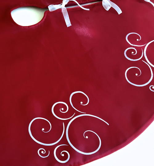 Great instructions and tutorial, thanks for sharing! I,love the elegant look of the white scrolls! I could see another option of adding some decopage on the swirls and sprinkling on some of that frosty type white glitter, the kind that has larger pieces, not the metalic type. You could also,sew or glue on some rhinestones within the scrolls, although not too large since eventually presents will be sitting on top! Although this skirt is so pretty you may want to use it on a table top ornamental tree to show it off better!