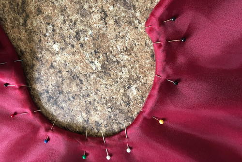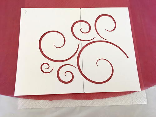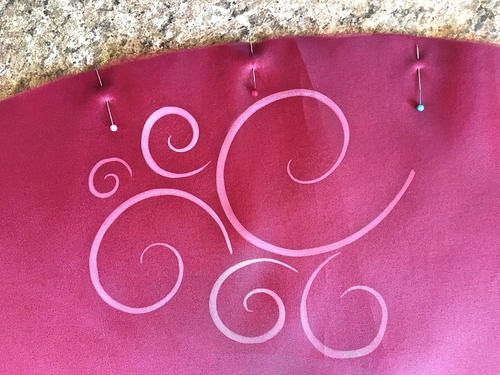 Place the centerline of the stencil over each pin with the bottom corners of the stencil aligned with the organza fabric edge. Place paper towels under the fabric to avoid smudging on the backside.