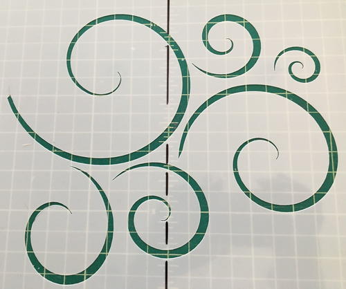 Mark the center of the scroll stencil with a line. Spray adhesive on the opposite side.