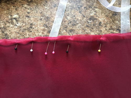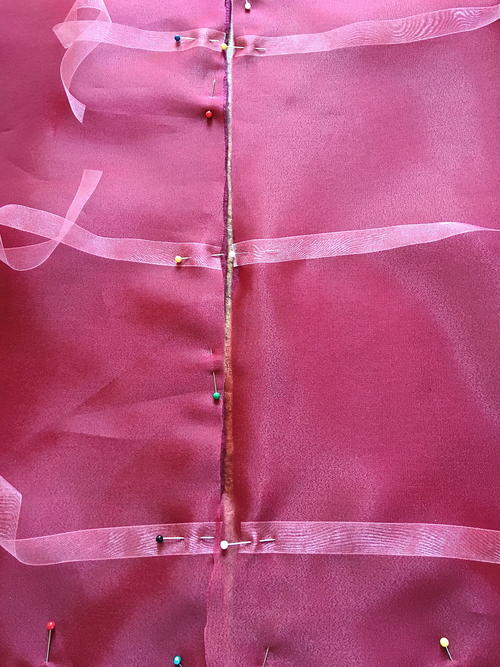 Before continuing, check to be sure there are no loose threads or lint between the organza and the fleece, which will be trapped when the remaining back seam is stitched close. Turn under the edges of the open back seam and pin it together. Topstitch the opening to close it and attach the center ribbon.