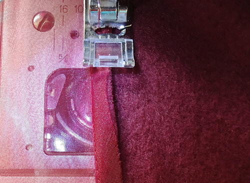 Flatten the seam allowance toward the fleece. Starting 2” from the center back, topstitch the two fabrics close to the seam. This will help the edge of the finished skirt to lay flat.