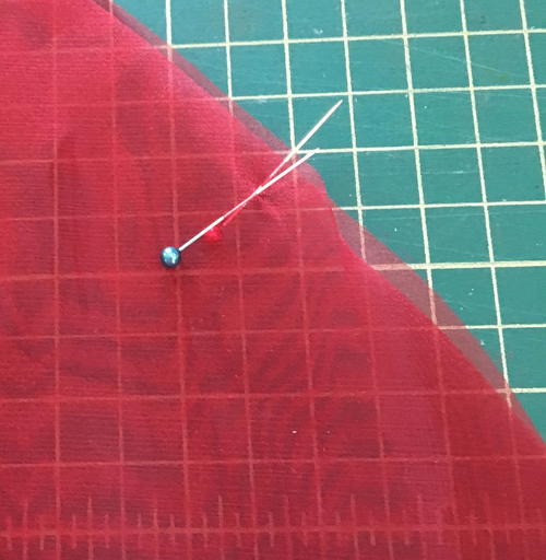 Put aside the fleece. Place pins as markers in the organza fabric at the small circles.