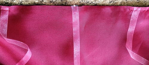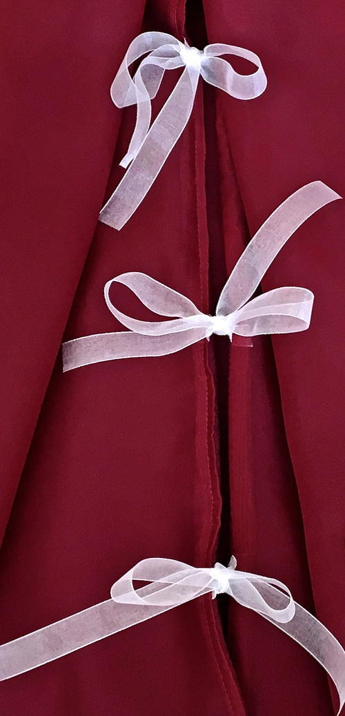 Cut six pieces of ribbon to measure 12” long. Pin three on each side of the back opening with the length of the ribbon between the layers. Position the first ribbon 3” from the bottom, the second 3” from the top, and the third half way between.