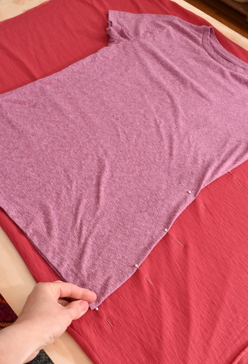 Begin by folding your fabric in half and centering an existing shirt on top of it, with the neckline positioned at the fold of the fabric (the fold will ultimately go across your shoulders). Place pins along the edge of the shirt as shown above… your seam will run down the holes nearest to the pinheads (see diagram below). Stop pinning once you get to the armpit of the shirt, and and make a mental note that that’s where you’ll need to end your seam once you start sewing. Repeat the same pinning process on the other side.