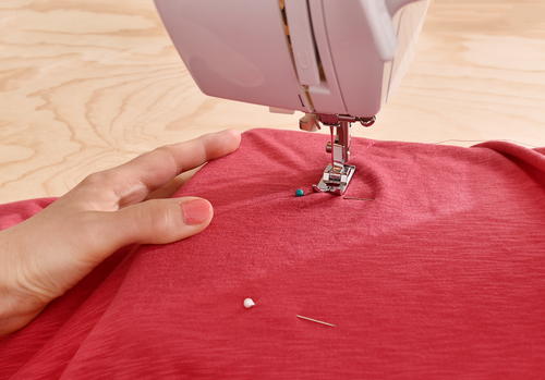 Now create the seam along the pinholes that are nearest to the pinheads. Remove the pins just before the presser foot runs over the pin so that you don’t break your sewing machine needle. Sew from the top pin all the way down to the open bottom of the folded fabric. Repeat the process on the other side. Note: This project could be done by hand as well! You could sew a backstitch using a needle and thread, or you could even use a brightly colored embroidery floss for a fun alternative.