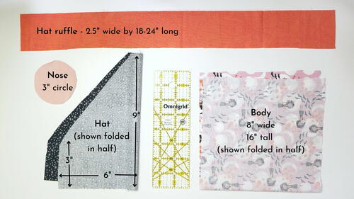 Cut out your fabrics (the photo diagram will help) 8” wide x 16” high rectangle for body, will be folded at the bottom; 3” circle of stretch fabric for nose (the omnigrid rotating mat makes it easy to cut circles); 9” tall by 12” wide for hat, folded to 9”x6” and cut off corner 3” from bottom (see photo); 2.5” wide x 18-24” long strip to make pleated hat ruffle; faux fur beard 8” wide by 5” tall triangle (see instructions)