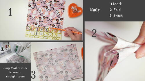 Fold body fabric with wrong sides together and mark a line across the bottom 1” from the fold. Then flip over and mark another line 1” up from the fold on other side.
