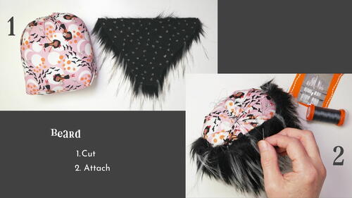 For a fur beard, cut a piece of faux fur 8” wide and 5” long. (TIP:cut only the backing of the fur so it will hang over the cut edges and look nice) Hand stitch or glue the beard to the top front of the gnome.